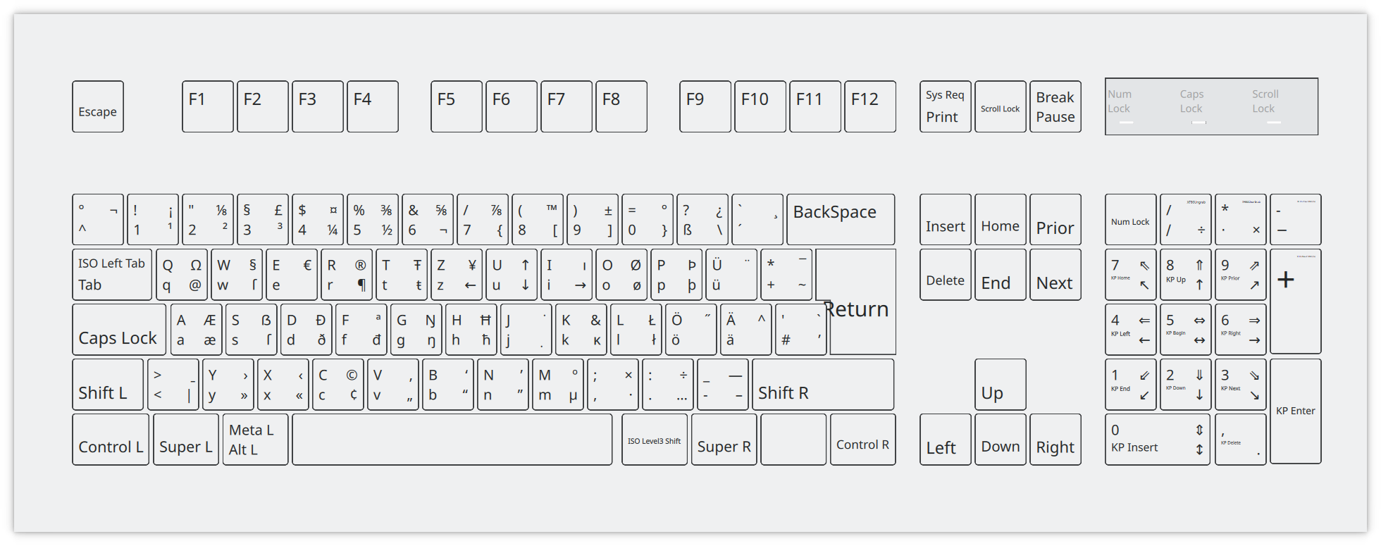 German X11 keyboard layout (de), variant nodeadkeys, option keypad:future: